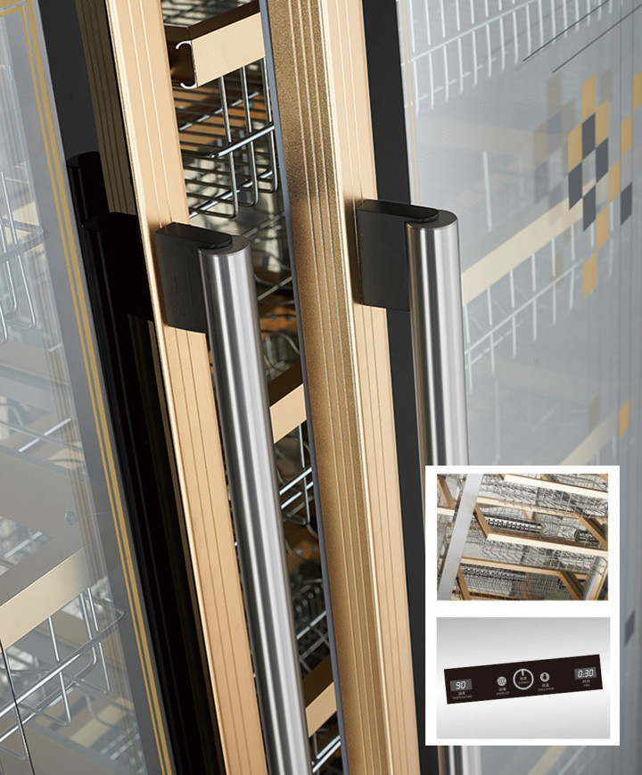 電腦控制觸摸屏,光波高溫消毒;可透視玻璃門(mén),整體發(fā)泡保溫;豪華不銹鋼把手,鋁合金推拉式導(dǎo)軌;特設(shè)超高溫保護(hù)功能。